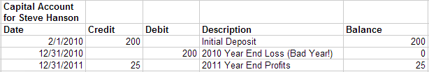 I made a new spreadsheet for each partner in the LLC and recorded when partners contributed money to the business. When the business lost money, that decreased everyone’s capital accounts because their share of the business was now worth less (because the business was worth less). When the business made money, the net income is credited among the capital accounts because their share of the business is now worth more. If you ever pay a dividend to the members, that debits their capital account because you’re taking money out of the business (and putting it directly into the pockets of the owners).