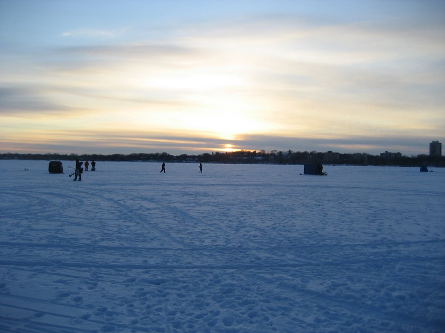 Those are fishing huts on frozen ice… in the middle of a lake.